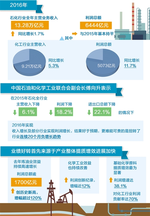 來自中國石油和化學工業聯合會的信息顯示,2016年,石化行業全年主營業務收入13.28萬億元,同比增長1.7%,利潤總額6444億元,與2015年基本持平;其中化工行業主營收入9.21萬億元、同比增長5.3%,利潤總額5073億元、同比增長11.7%。中國石油和化學工業聯合會副會長傅向升表示,在2015年石化全行業主營收入下降6.1%、利潤下降18.2%、進出口總額下降22.1%的情況下,2016年實現收入增長及部分行業實現利潤增長,結果好于預期。更難能可貴的是,扭轉了行業連續20個月負增長趨勢。