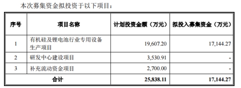 2014年遞交的招股說明書(申報稿)中顯示,擬投入募集資金25,838.11萬元,其中,有機硅及鋰電池行業專用設備生產項目19,607.20萬元、研發中心建設項目3,530.91萬元、補充流動資金項目2,700.00萬元。