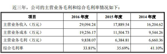招股書顯示,2014年度、2015年度、2016年度,公司營業收入分別為16,400.64萬元、18,076.33萬元、29,268.06萬元;實現歸屬于發行人股東的凈利潤分別為2,701.16萬元、2,394.07萬元、4,311.77萬元。