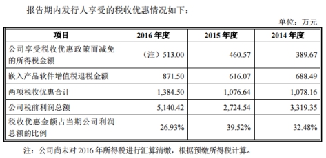 2014年度、2015年度、2016年度,稅收優惠金額佔當期公司利潤總額的比例分別為32.48%、39.52%、26.93%。其中,2016年,嵌入產品軟件增值稅退稅金額達到871.50萬元,大幅增大。