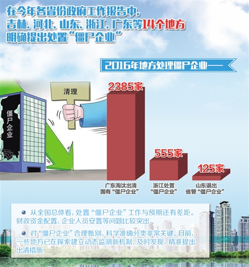 “僵屍企業”清理正在加速。據了解,在今年的各省份政府工作報告中,吉林、河北、山東、浙江、廣東等14個地方明確提出處置“僵屍企業”。各地去年處置“僵屍企業”的成績單也紛紛曬出:廣東淘汰出清2385家國有“僵屍企業”,浙江處置555家“僵屍企業”,山東125家省管“僵屍企業”退出……