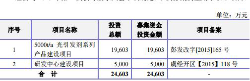 1.5000t/a 光引發劑係列產品建設項目,投資總額19,603萬元,募集資金投資金額19,603萬元;2.研發中心建設項目,投資總額5,000萬元,募集資金投資金額5,000萬元。