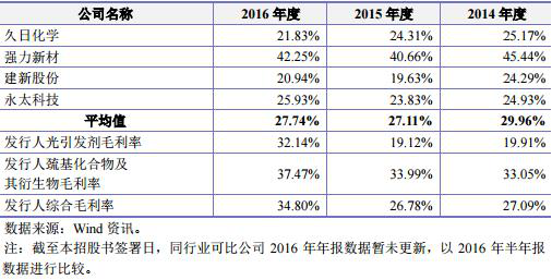 久日化學2014年至2016年1-6月綜合毛利率分別為25.17%、24.31%、21.83%;強力新材2014年至2016年1-6月綜合毛利率分別為45.44%、40.66%、42.25%;建新股份2014年至2016年1-6月綜合毛利率分別為24.29%、19.63%、20.94%;永太科技2014年至2016年1-6月綜合毛利率分別為24.93%、23.83%、25.93%。