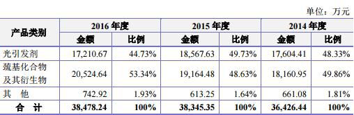 數據顯示,光引發劑2014年至2016年收入分別為17,604.41萬元、18,567.63萬元、17,210.67 萬元;佔主營業務收入比例分別為48.33%、49.73%、44.73%。