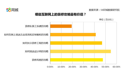 數據顯示,在搜索裝修攻略的過程中,業主們對網絡上的各種裝修信息有著不同程度的“偏愛”。47.58%的人認為裝修風格的攻略比較有價值;54.77%的人認為如何挑選裝修設計師或裝修公司的工作最有用;46.84%認為如何拆分裝修工程給包工隊的攻略更有價值,可以直接用;41.14%的人認為在網上挑選五金家具和定制櫥櫃的攻略最有用;19.45%的人認為裝修隊施工、拆建攻略最有價值。