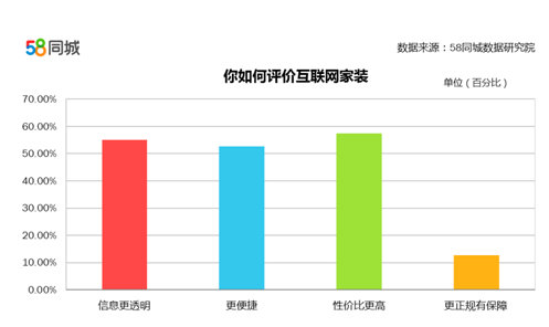 在對互聯網家裝的認識上,透明度高、便捷性強、性價比高,這三個互聯網家裝的最大優勢已經得到了廣大業主的肯定。對比傳統裝修,55.02%的業主認為互聯網家裝信息更透明,52.66%的業主認為互聯網家裝更便捷,57.5%的用戶認為互聯網家裝性價比更高。