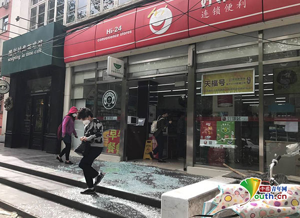 5月5日早上8時50分,一便利店玻璃門因大風肆虐,被吹倒破碎一地。中國青年網記者 張瑞宇攝