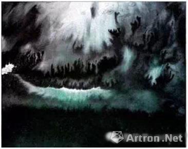 劉佑局先生的《幽境》與《滄海涌日圖》異工同曲,雲濤翻滾,滾滾雲頭如群龍奔襲而來,煙雲之際後是照亮天際的太陽,旭日將打破這襲來烏雲震撼心靈夢幻般的“幽境”。兩幅圖都是在表達太陽,都是在告訴觀眾烏雲黑浪幽境背後的熱烈和希望。《幽境》的潑墨染彩相互滲透,或者說劉先生用中國畫創新的人為暈散繪畫語言表現墨潑彩染地藝術效果,卻又不受中國傳統繪畫技法的束縛“任性”的夢幻得那麼自然。黑白交匯處電光似火焰的青綠,將黃公望為首的“元四家”點、染、皴、擦四法,拿來“任性”或變法的放縱在其照片之中。劉佑局先生,把人們對熟知的一個個具象烏雲抽象出夢境的一般和觀眾互動在夢幻般的簡約中,表現了新繪畫語言與傳統繪畫語言統一在繪出的具象上。與《滄海涌日圖》誇張中國傳統繪畫線條、黑白對比,將具象的浪頭點睛成群龍奔騰,與雲天相接一樣,大有濤涌日出鎮山河之勢。