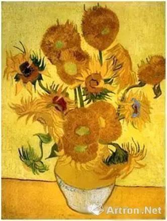 劉佑局先生是用西方油畫丙烯染料作施彩媒介,讓淡墨與色彩在中國傳統繪畫生宣上表達自己的思想,向觀眾講述他自己認可地故事。他的洋為中用是對中國畫繼承基礎上的發展,是用外語向外國人講中國故事的必然,是借用西方繪畫語言展現中國傳統繪畫思想的“任性”。劉佑局先生的《一枝一葉總關情》繪的是一枝花!一簇花!他借鑒了西方油畫的筆觸技法和透視效果,狂“點”、猛“皴”、強“染”、硬“擦”,使得中國到元朝中後期以黃公望為首的“元四家”技法和畫韻,由細膩到粗放含蓄到張揚。在劉佑局先生“任性”的探索下,梵高1888年《向日葵》(圖四)油畫的筆觸技法與中國畫筆鋒技藝逐漸趨于統一。在這里中國畫的線條還是西方油畫的色塊都不再重要了,重要的是觀眾進入兩幅畫告訴我們,是一葉一葉一枝一枝簇擁在一起的花,每一葉都關著枝的情,每一枝都關著葉的意,和《向日葵》一樣都關係著太陽的恩。他們的繪畫語言,都迸發著具象事物的狂熱和頓悟抽象的衝動,猛烈的追逐著即興而作地快感。《一枝一葉總關情》與《向日葵》就是在陽光明媚燦爛的中國與法國南方所作。《一枝一葉總關情》像閃爍著耀眼的陽光,是那樣華麗美艷。《向日葵》用黃色代表陽光與向日葵又是那樣和諧的不為烈日灼傷,是梵高細膩筆觸優雅線條思想靜怡地佳作。他們都那麼富有蓬勃向上和旋轉不停的運動感,筆法與筆觸都是那樣粗獷有力,色彩不僅簡約且對比強烈,如同中國陶瓷宋金時代素三彩一樣,簡約不簡單。在這粗筆厚彩和主題單純中充滿了各自的智慧和靈氣地“任性”。讓人無不為這呼喚人心的畫面效果而感動,心靈為之震顫激情為之噴薄而出,融入到大師們豐富的思想感情中去。無名花和向日葵不再僅僅是植物的具象,而是繪畫語言的衝動和一枝一葉勃勃生機總關情的生命。