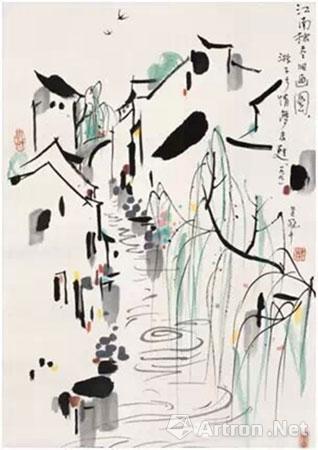 劉佑局先生認為:繪畫是各民族都存在的一種藝術形式,繪畫與世界接軌的可能性更大,並全力地轉向繪畫研究與創作。“任性”的是中國畫與世界繪畫接軌的堅持,是在堅持中國畫的基礎上借鑒西方繪畫語言,傳播和宣傳中國繪畫文化與思想,是對前人探索中國繪畫突破的繼承、發揚和光大。劉先生的《山色流芳》(圖五)清新、明快、亮麗,西方傳統油畫是少有這種用線條直觀表現的。紅、綠線條是中國傳統繪畫的雙線勾勒,易山易水易柳都在流動。如吳冠中大師的《雙燕》(圖六),紅、黃、嫩綠表現山色風動與柳枝蕩漾小巷生機,墨色繪山巒穩固小巷積水靜動線條清晰、集水成洼的江南水鄉。盡管劉佑局先生加入了更多的西洋技法,畫作還是將我們代入清新、輕松、爽朗、簡約的村頭江南山鄉,其藝術效果都是在求同存異中,用色彩的創新手法升華中國傳統繪畫的婉約內涵思想。