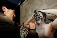 12月22日下午,居住在青海省黃南藏族自治州同仁縣年都乎村的土族民眾舉行“跳於菟”活動。圖為工作人員正在給一名臉上涂滿煤灰的土族民眾畫“虎臉”。中新社發 胡貴龍 攝