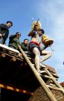 12月22日下午,居住在青海省黃南藏族自治州同仁縣年都乎村的土族民眾舉行“跳於菟”活動。圖為一名“跳於菟”表演者正在下扶梯。中新社發 胡貴龍 攝