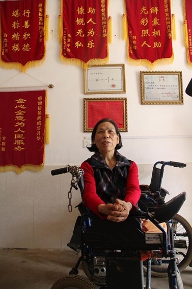 2014年5月13日,心係天下在路上公益團隊帶著關愛與溫暖,來到湖南湘潭市板塘鄉板凳媽媽家中。當時板凳媽媽剛做完第二個療程的化療在家靜養,整個人看上去十分虛弱。但在與公益團隊交談時,她始終面帶笑容,樂觀向上的心態再次感染了記者與公益團隊。