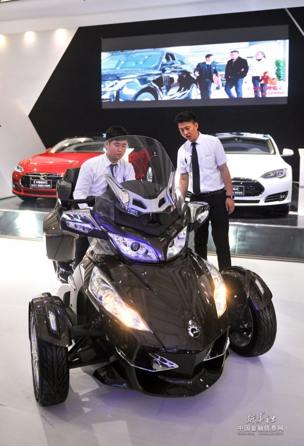 7月16日,工作人員在調試一輛展出的龐巴迪三輪摩托車。新華社記者許暢攝