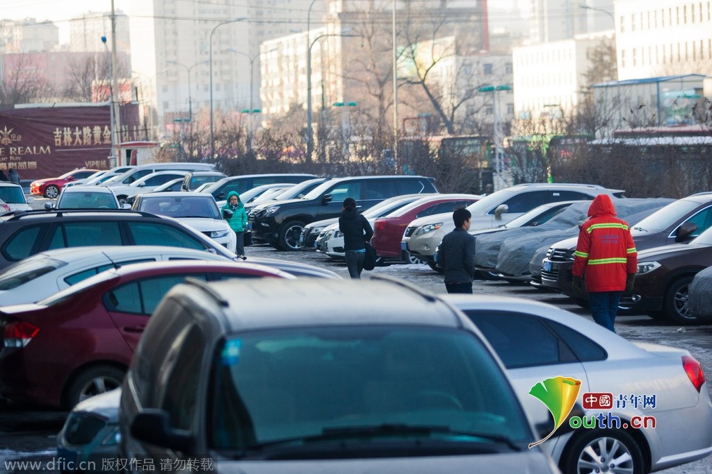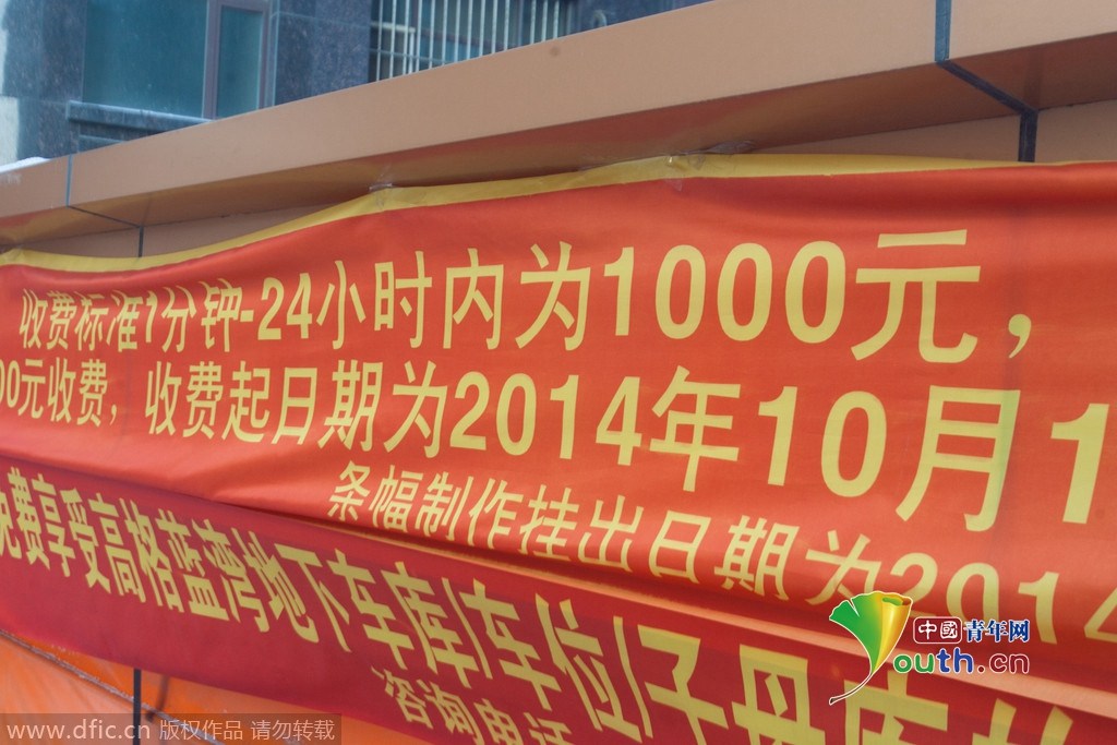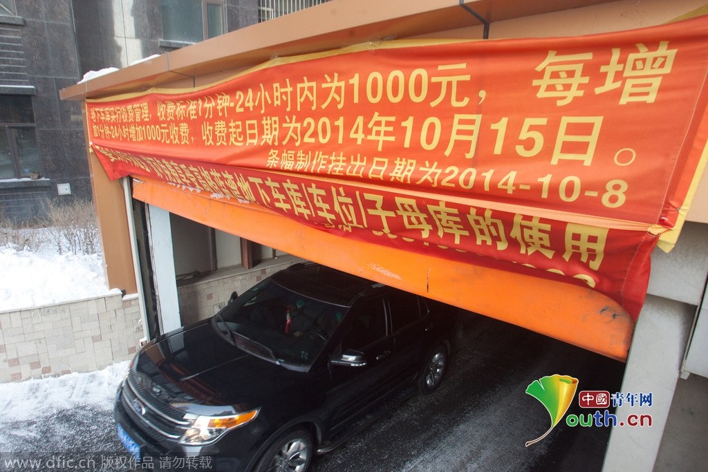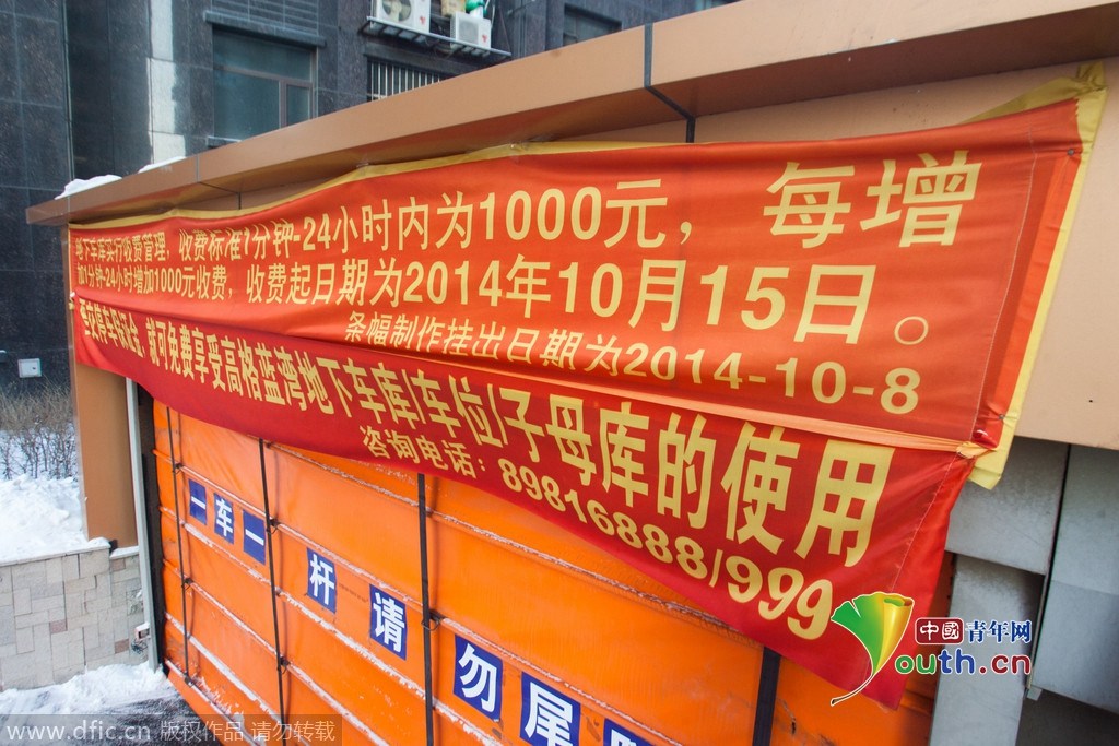 2015年1月19日,吉林長春,一小區地下車庫貼出停車1分鐘至24小時收費1000元,但是繳納保證金就能夠免費停車。小區外的空地上停滿了車。