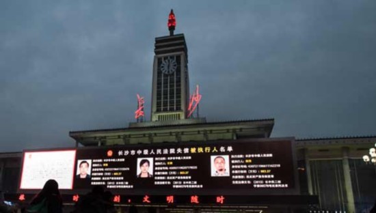 長沙中院執行三庭副庭長王力夫介紹,由于長沙火車站是長沙市最重要的窗口單位,也是省內規模最大人口集散地,因此選擇將火車站前坪大屏幕作為公布失信被執行人名單的平臺。這次共公布了中院及芙蓉區法院的54名“老賴”,“他們存在違反財產報告制度、拒不履行生效法律文書、或隱匿行蹤拒不接受法院傳喚而規避執行等情形。”