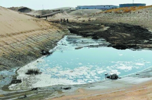 3月21日,記者來到位于武威市區以東約20公里的騰格里沙漠,在公路北側看到一個圓柱形金屬罐體,北側百米處是一個長約百米的不規則的天然沙坑,坑底沙土呈黑色,坑里的污水已于近日被抽走,送污水處理廠處理。隨後,記者沿公路向東行駛,不久又發現一處相同的罐體,北側兩三百米也是一個天然沙坑,面積比第一個大許多,遠遠地就聞到一股臭味,尚存的污水呈黑褐色,約兩個籃球場大小,坑底泥沙被污水染成黑色,與四周黃色的沙漠對比鮮明。