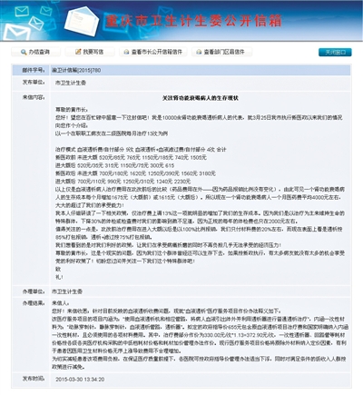 重慶市衛計委公開信箱“關注腎功能衰竭病人的生存現狀”問答截圖。