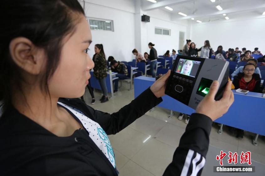 4月10日,河南工業大學新聞與傳播學院播音專業的大學生們上課前用“人臉識別器”簽到。用高科技的“刷臉”設備進行上課簽到,代替了傳統的簽到制度,有效避免了學生逃課行為,被老師稱為“防逃課神器”。據實行“防逃課神器”的該院播音與主持藝術教研室主任李紅光老師介紹,“人臉識別器”是他新推行的一種考勤打卡制度,主要針對播音專業的兩個班學生早晨練聲使用,自從使用了它後出勤率達到百分之百。對“刷臉上課”,很多學生亦表示讚同。楊正華 攝