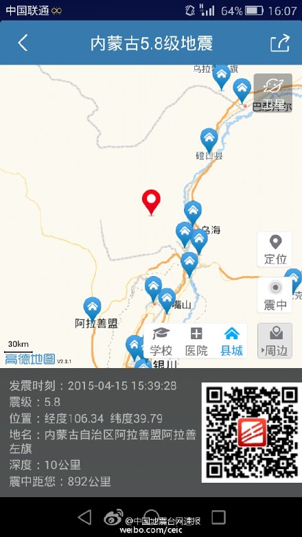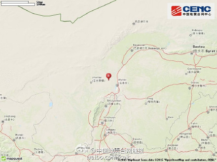 據國家地震臺網官方微博消息,中國地震臺網自動測定:4月15日15時39分在內蒙古自治區阿拉善盟阿拉善左旗附近(北緯39.8度,東經106.5度)發生5.8級左右地震,最終結果以正式速報為準。