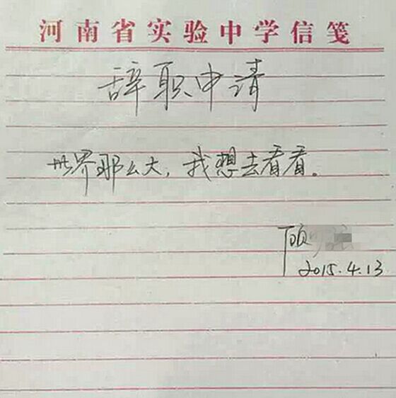 “世界那麼大,我想去看看。”看完這句話,頓覺很詩意、很瀟灑、很有文藝范兒,不過,這卻是一封辭職信。