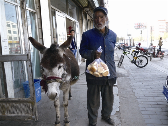 一位對這位牽驢行乞的老人熟悉的居民告訴記者,這位老人一生沒有結婚,不知道什麼時候開始牽來一匹毛驢乞討。剛剛給“牽驢老人”一袋面包的蛋糕店店主表示:“老人牽著毛驢來過兩次了,經常站著不走,毛驢就在門口拉糞。老人要是真有困難,可以幫他咨詢一些救助單位,可每次只告訴我他是一個當兵的。”(記者 樊瑞 攝影報道)