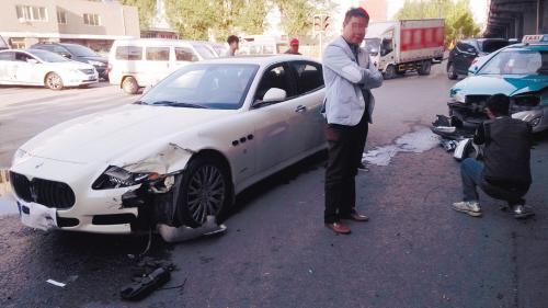 5月9日17時許,沈陽晚報、沈陽網記者趕到鐵西區滑翔五金城南門,在馬路邊見到了事故車輛。出租車前保險杠脫落,左右大燈也被撞碎。而瑪莎拉蒂轎車則左前臉受損嚴重,左側保險杠和大燈均破損,被撞掉的保險杠壓在了左車輪下。事故已經發生了幾十分鐘,仍然有眾多圍觀者,“這撞一下又得撞進去幾十萬。”