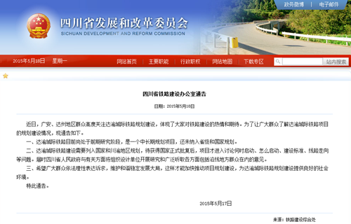 中新網5月18日電 據四川省發展和改革委員會網站消息,針對日前四川鄰水縣群眾為表達達渝城際鐵路過境鄰水的意願自發聚集遊行事件,四川省鐵路建設辦公室日前發布通告稱,達渝城際鐵路目前尚處于前期研究階段,是一個中長期規劃項目,還未納入省級和國家規劃。