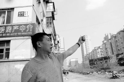 崔懷彬指著被開發後的小區,其背後的3棟居民樓尚未拆除。京華時報記者 常鑫 攝