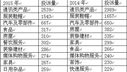 2015年投訴量居前十位的商品和服務依次是:通訊類產品、服裝鞋帽、汽車及零部件、食品、房屋、餐飲服務、裝修建材、媒體購物服務、家具、日用雜品。