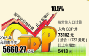 中安在線3月25日訊據安徽商報消息 昨日,《合肥市2015年國民經濟和社會發展統計公報》出爐。統計顯示,去年合肥市GDP5660.27億元,人均GDP為73102元。常住居民人均可支配收入26605元,增長9.6%。