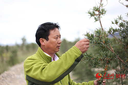 南木林縣林業局局長次仁頓珠正在查看沙棘的挂果情況(人民網賈興鵬 攝)