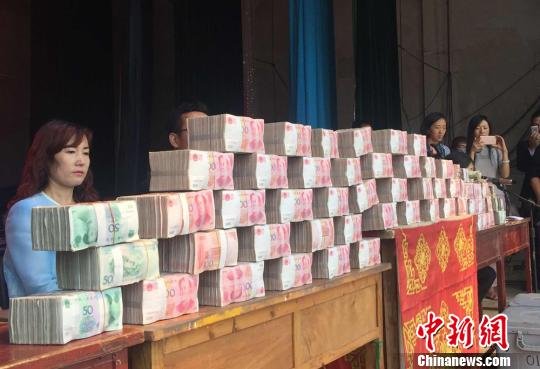 8月27日,甘肅臨洮縣機場村村支書邊國勝現場向村里的80多戶農民發放種植樹苗分紅。中新網蘭州8月28日電 (記者 劉玉桃 魏建軍)27日,甘肅臨洮縣機場村廣場,圍滿了前來排隊領錢的村民,村支書邊國勝向村里的80余戶農民現場發放種植樹苗分紅現金560萬元,最多的農戶領到10萬元分紅。在此之前,已有部分農戶領取分紅,此次分紅共計1000多萬元。圖為發放現場。劉玉桃 攝