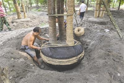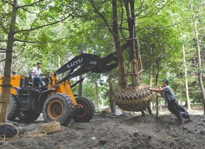 工人師傅將銀杏樹根莖包裹起來方便運輸