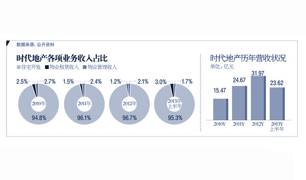 除去負債率之外,時代地產的利潤也有小幅度的下滑。2013年1-9月累計合約銷售額為57億元,合約銷售面積63萬平方米,毛利潤為9.9億元。另外,與去年相比,公司利潤亦出現小幅度下降,今年上半年,時代地產的利潤為1.6億元同比下降3.7%。對此,時代地產給出的解釋是市場推廣成本及行政開支增加。