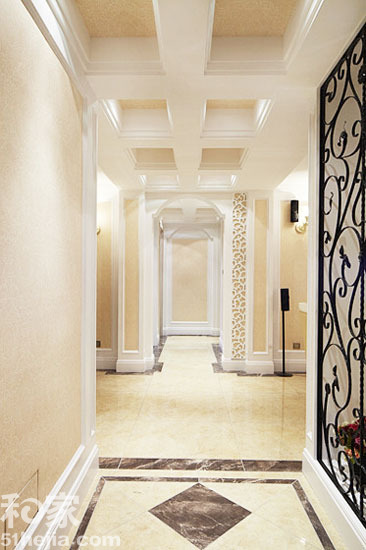 進門玄關是一條徑直的過道,往左拐是餐廳,往右拐是客廳。整面牆都刷了米黃色的牆漆,搭配淺米黃色的地磚,襯托出溫暖的感覺。