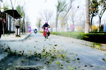 11月26日,城區刮起3到4級的南風,在青年路上,陣風卷起地上的落葉合著沙土撲面而來。
