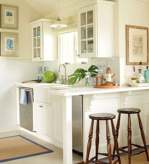2014年美式裝修風格:廚房採用白色與少量藍色搭配,而藍色由裝飾畫以及地毯給予,清新而明亮;兩個頂櫃用作收納碗碟,對稱挂壁與窗戶兩邊,絕妙的利用到了牆壁空間;操作臺垂直部分用木板延伸桌面,放上兩張座椅,很出色的打造出一個簡易餐臺區。