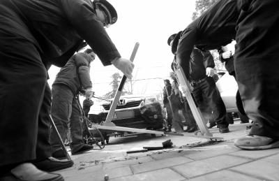 工作人員正在拆除地鎖。京華時報記者歐陽曉菲攝
