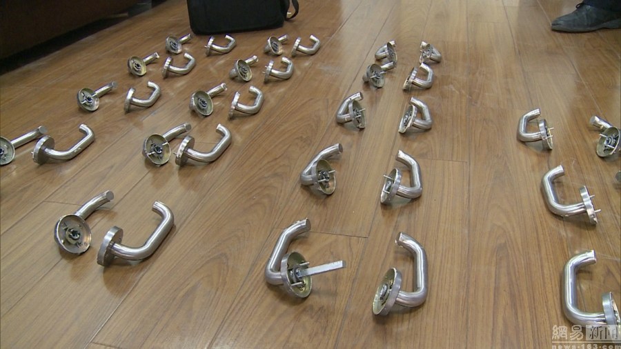 2015年1月9日,上海,一名擁有碩士學歷的男子,將整幢公租大樓的18個樓層共36把門把手全部拆下偷走,終被物業工作人員發現,近日該男子被警方抓獲。據其交代,偷門把手是為了拿回老家裝修自己的新房子用。圖為男子偷拆的門把手。