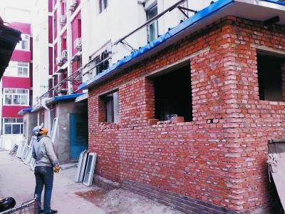 記者在民主北街22號院,由于抗震節能改造施工仍在進行中,民主北街22號院幾棟住宅樓上原本挂著的地名牌和樓號不見了蹤影,院子里就像是一個大地工,每棟樓的一層外,都緊挨著樓體密密麻麻蓋滿了紅磚壘起來的小房。有的小房已經在紅磚牆外抹上了洋灰,裝好了塑鋼窗和防盜門,住進了居民;有的蓋了一半,還沒有進行內部裝修。院內的每棟樓都被違建團團圍住,只有二樓以上才能看出原本樓房的樣子,兩棟樓之間曾經寬敞的間距如今只剩下一條狹窄的小胡同供人通行。