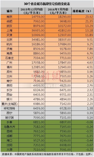 中新網記者梳理國內30個省會城市(包括直轄市、首府;不包括“拉薩”,因缺乏數據)今年以來新房價格走勢情況發現,南京、合肥、武漢三個省會城市的今年房價漲幅超過了北京、上海、天津三個直轄市。躍升為樓市“四小龍”中的南京、合肥房價漲價超兩成,每平米分別漲到18290元、9698元。其中,南京房價超過廣州,僅次于上海、北京。