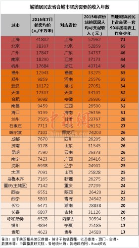 不談各個城市是否存在限購等政策,若按各地2015年城鎮居民人均可支配收入計算,北京、上海、廣州城鎮居民人均可支配收入較高,但買房承擔的壓力依然居前幾位。北京為例,城鎮居民靠一人工作賺錢全額付款買90平米的房子需要攢錢65年,如果夫妻兩人共同承擔則工作近7年的收入就可付20%的首付款購買首套房。