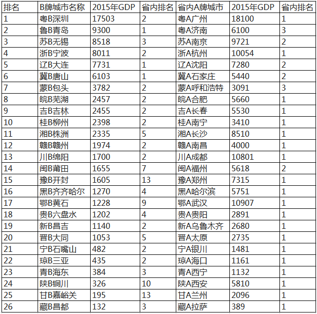 按照英文字母排序,省會無一例外都是A,當時各省、自治區內的第二大城市,基本都被挂上了B牌。也就是說,在某一個省里,如果你生活在“B牌城市”,那麼這個城市的重要性可能僅次于省會,甚至與省會同等重要。而衡量一個城市的重要性和地位,經濟發展尤其是GDP數量的大小是一個重要的指標。
