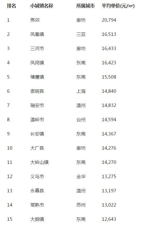 在燕郊之後,廊坊還有3個小城鎮入圍,其中三河市以16433元/平方米的價格高居第3,大廠以14276元/平方米位居第10,香河位居第19,固安位居第24。