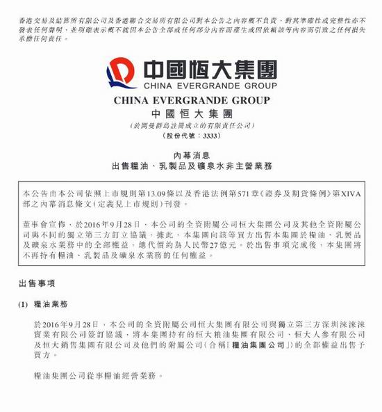 董事會宣布,于2016年9月28日,本公司的全資附屬公司恆大集團公司及其他全資附屬公司與不同的獨立第三方訂立協議,據此,本集團向該等買方出售本集團于糧油、乳制品及礦泉水業務中的全部權益,總代價約為人民幣27億元。于出售事項完成後,本集團將不再持有糧油、乳制品及礦泉水業務的任何權益。