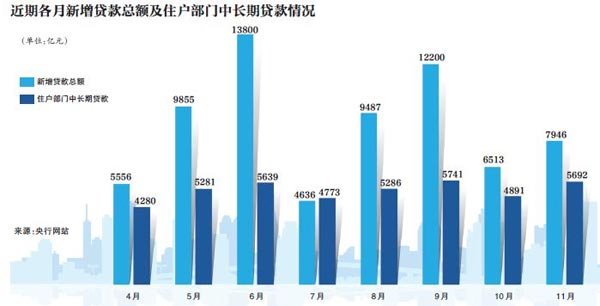 在今年下半年不少城市出臺限購措施後,代表個人住房貸款的住戶部門中長期貸款依舊在新增貸款中佔據較高的比例。根據央行披露的數據,11月份住戶部門貸款增加6796億元,其中短期貸款增加1104億元,中長期貸款增加5692億元,佔到新增貸款7946億元的71.6%。