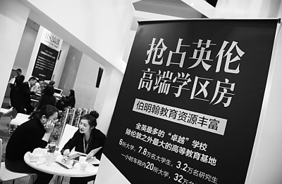 2017年4月13日,為期四天的2017北京春季房地產展示交易會開幕。一家海外置業投資機構打出“搶佔英倫高端學區房”標語吸引中國買家。光明圖片/視覺中國