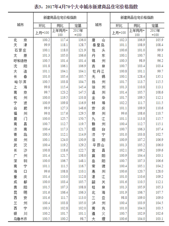 國家統計局今日發布了2017年4月份70個大中城市住宅銷售價格統計數據。70個大中城市中,8城市新建商品住宅價格環比下降,其中三亞降幅最大。4月份70個城市中有23個城市新建商品住宅價格漲幅比上月回落,比3月份增加13個;7個城市由上月上漲轉為持平或下降;3個城市降幅擴大。