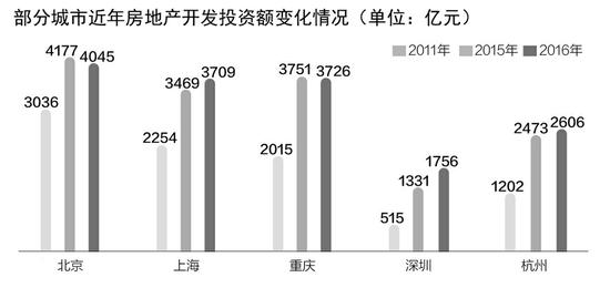 《每日經濟新聞》記者梳理發現,在國家統計局公布的35個主要城市中,2011年,北京、上海和重慶房地產開發投資額佔據著前三位;到了2015年和2016年,北京、重慶、上海房地產開發投資額同樣位列前三位。